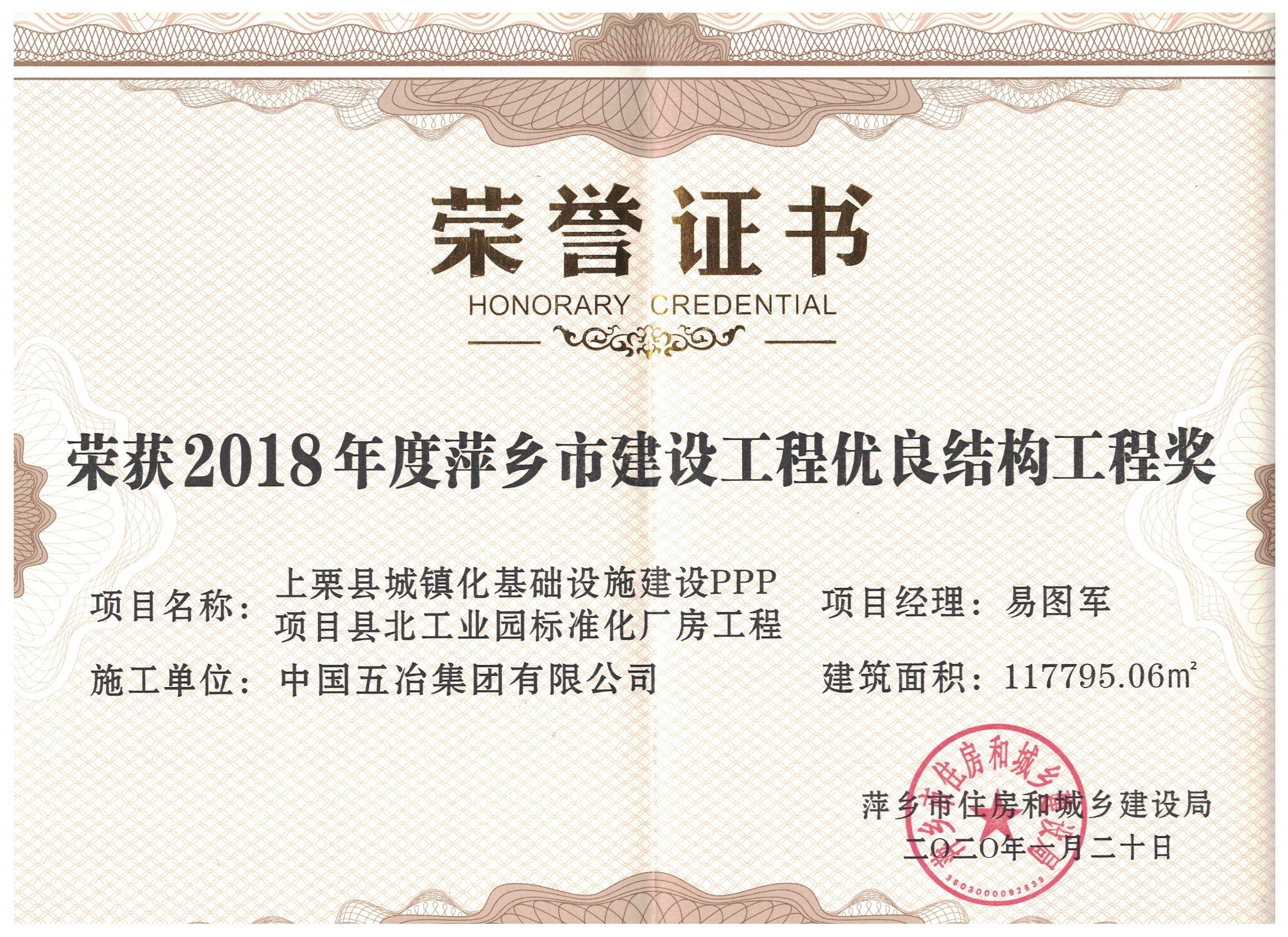 上栗縣城鎮(zhèn)化基礎(chǔ)設(shè)施建設(shè)PPP項(xiàng)目縣北工業(yè)園標(biāo)準(zhǔn)化廠房工程榮獲2018年度萍鄉(xiāng)市建設(shè)工程優(yōu)良結(jié)構(gòu)工程獎(jiǎng)