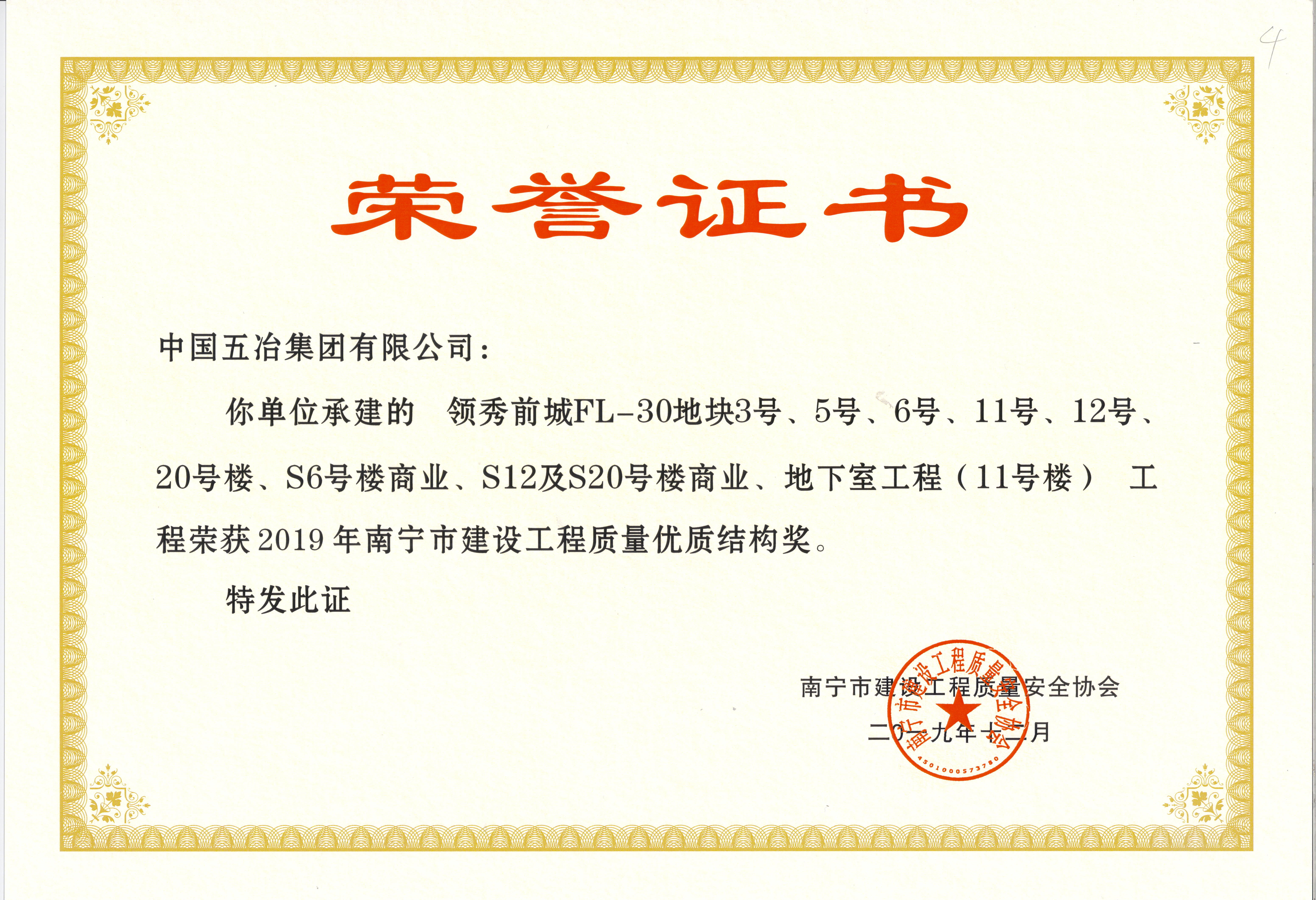 領秀前城FL-30地塊工程—2019年南寧市建設工程質(zhì)量優(yōu)質(zhì)結(jié)構(gòu)獎