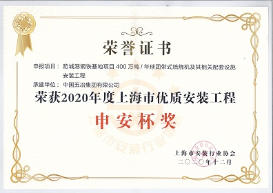 防城港鋼鐵基地項目400萬噸/年球團帶式焙燒機及其相關(guān)配套設(shè)施安裝工程-2020年度上海市優(yōu)質(zhì)安裝工程申安杯獎