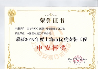 寶之云IDC四期3號樓機房總包工程-2019年度上海市優(yōu)質(zhì)安裝工程申安杯獎