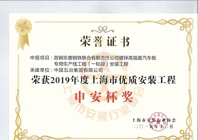 首鋼京唐鋼鐵聯(lián)合有限責任公司鍍鋅高強度汽車板專用生產(chǎn)線工程(一標段)安裝工程-2019年度上海市優(yōu)質(zhì)安裝工程申安杯獎