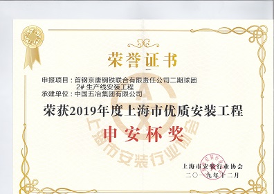 首鋼京唐鋼鐵聯(lián)合有限責任公司二期球團2#生產(chǎn)線安裝工程-2019年度上海市優(yōu)質(zhì)安裝工程申安杯獎