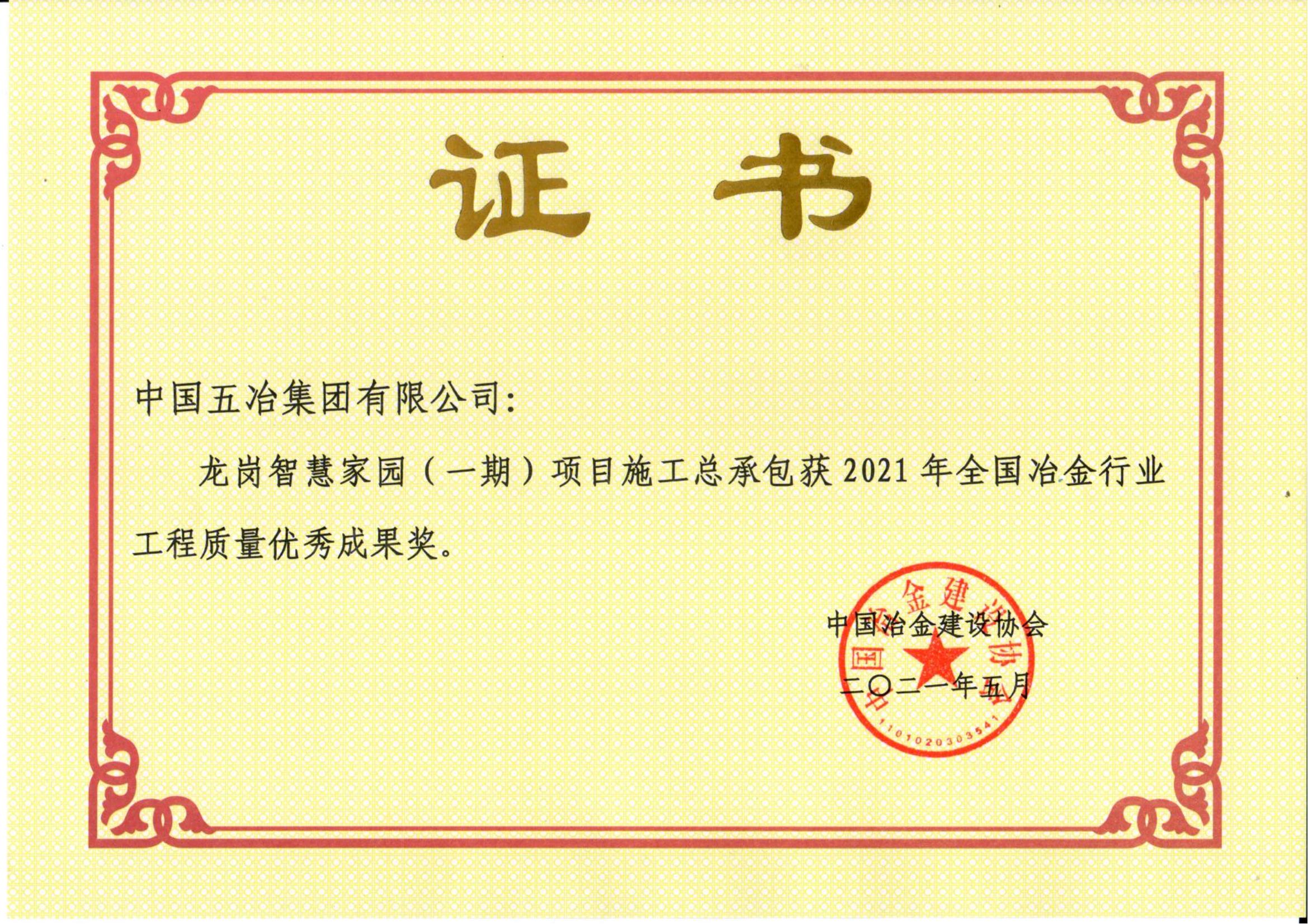 龍崗智慧家園(一期)項(xiàng)目施工總承包獲2021年全國(guó)冶金行業(yè)工程質(zhì)量?jī)?yōu)秀成果獎(jiǎng)