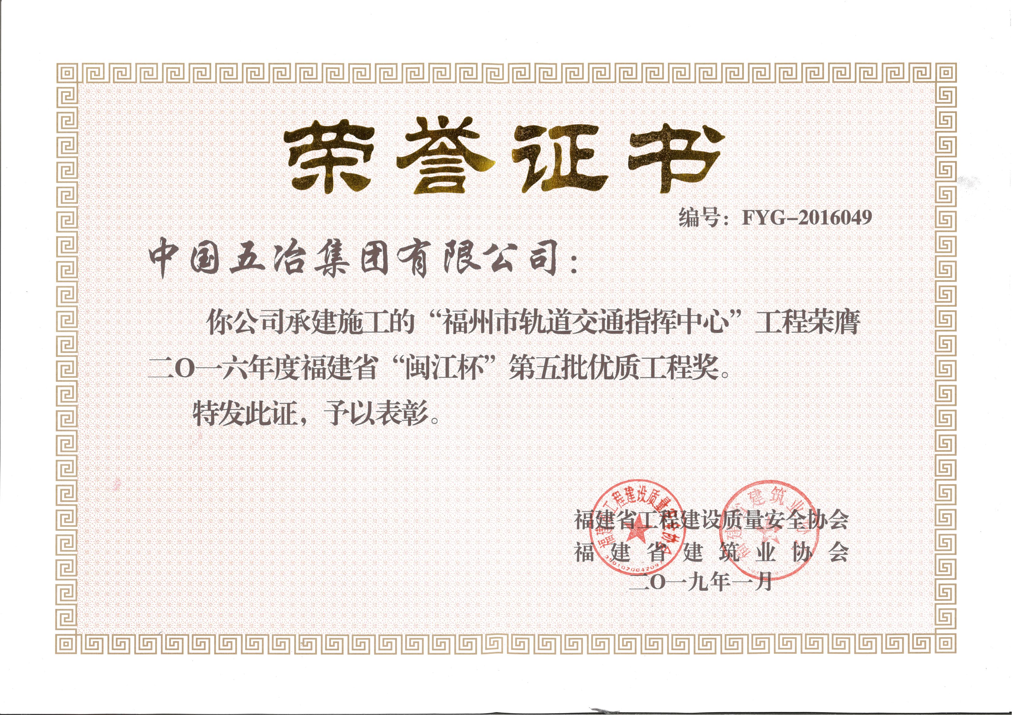 福州市軌道交通指揮中心工程榮膺二0一六年度福建省“閩江杯”第五批優(yōu)質(zhì)工程獎(jiǎng)