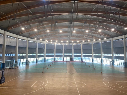 “天府小巨蛋”面積約4611平方米,位于飛行保障園區(qū)中心位置,分為地上兩層,地下局部一層。一層布置有球場、器械室、空調(diào)機房、男女衛(wèi)生間及淋浴室等,二層為音控室、管理用房等,負(fù)一層為健身房等;一層內(nèi)部球場布置有1個籃球場,8個羽毛球場,8個乒乓球桌,滿足多種運動需求。