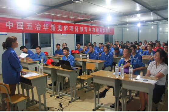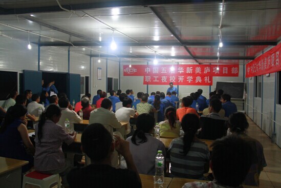 9月1日,在這個(gè)全國大大小小學(xué)校開學(xué)的日子,一公司華新美廬項(xiàng)目部職工夜校也迎來了第一批“學(xué)生”。晚上七點(diǎn)半,華新美廬項(xiàng)目部管理人員、民工,一公司黨群部、安全部、人力資源部代表共七十余人著工裝整齊入場,華新美廬項(xiàng)目部“職工夜?!遍_學(xué)典禮拉開了序幕。