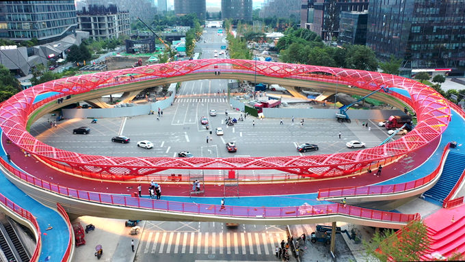 以高顏值爆紅的“交子之環(huán)”景觀橋,由結(jié)構(gòu)環(huán)、交通環(huán)和風(fēng)雨環(huán)廊三部分構(gòu)成。寬達(dá)10米、周長300米的橋面將陸續(xù)呈現(xiàn)通行、休閑、表演、運(yùn)動(dòng)等場景,使其成為全國首座擁有多元場景的人行天橋。