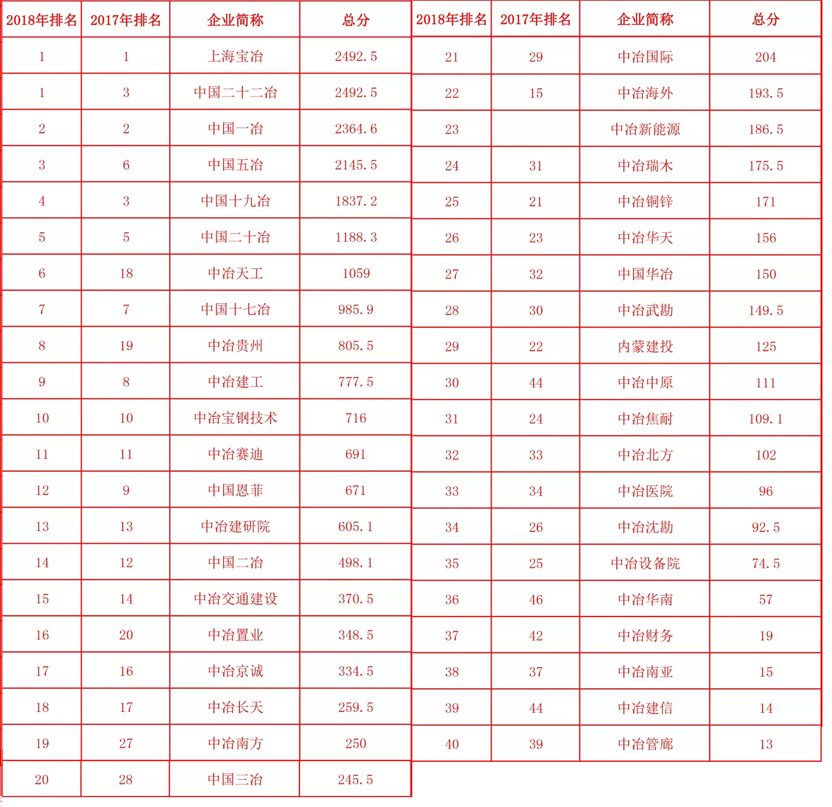 2018年度中冶集團(tuán)子企業(yè)新聞宣傳排名
