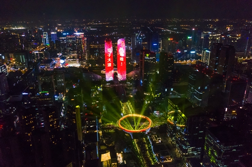 從高空俯瞰,內(nèi)直徑達(dá)90米、外直徑達(dá)110米的“交子之環(huán)”景觀橋,如同紅色巨環(huán)般耀眼奪目,與高達(dá)218米的天府國(guó)際金融中心雙塔東西相望,一齊閃耀在成都金融城的璀璨夜色中。