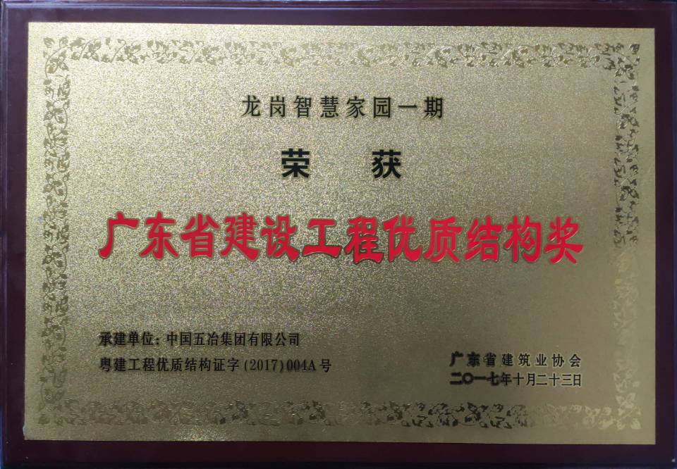 龍崗智慧家園一期工程評定為二零一七年廣東省建設(shè)工程優(yōu)質(zhì)結(jié)構(gòu)獎