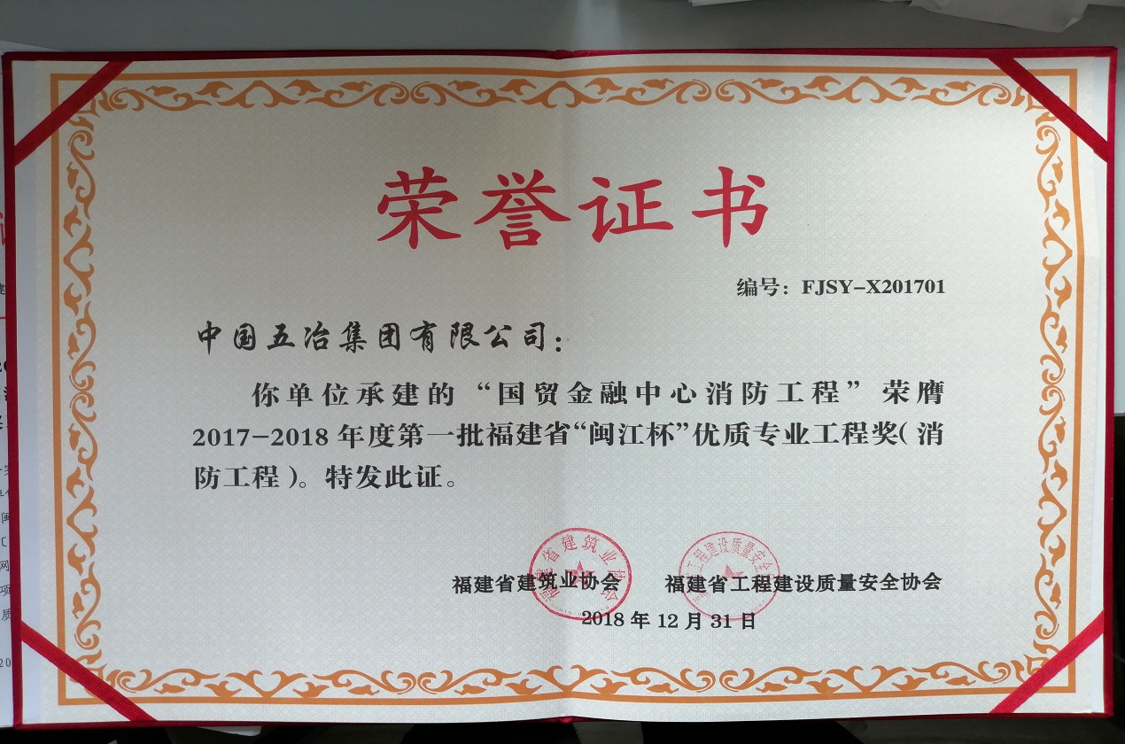 國貿金融中心消防工程榮獲2017—2018年度第一批福建省“閩江杯”優(yōu)質專業(yè)工程獎(消防工程)
