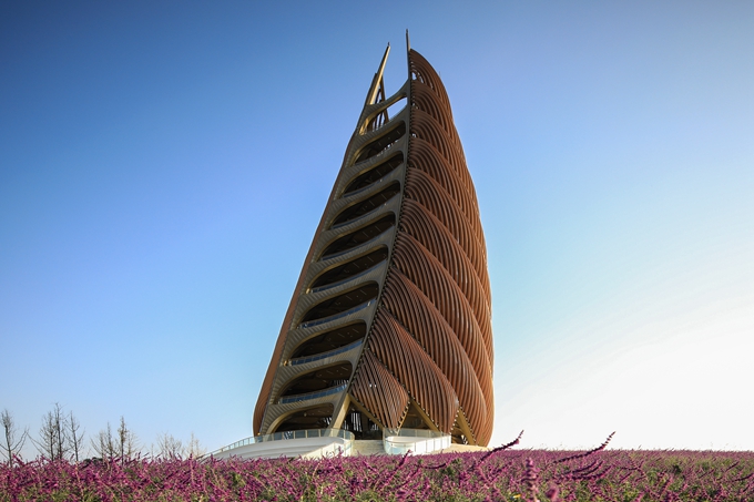 同時(shí),為最大程度模擬“春筍”表面的紋理與脈絡(luò),在裝飾裝修階段,項(xiàng)目團(tuán)隊(duì)共采用了近672根單曲不重復(fù)的弧形月牙格柵來(lái)編織“春筍”的全曲面幕墻外衣,每一根格柵的大小、形狀都不一樣,最大的一根格柵長(zhǎng)度達(dá)13.688米,自重超600公斤,所有格柵必須嚴(yán)密對(duì)應(yīng),每一根格柵和指定位置的偏差必須控制在3毫米內(nèi),為此項(xiàng)目團(tuán)隊(duì)采用BIM技術(shù)來(lái)實(shí)現(xiàn)精密“織衣”:運(yùn)用全站儀將各編號(hào)關(guān)鍵點(diǎn)進(jìn)行測(cè)放,確定不同軸間每根月牙格柵連接件的坐標(biāo)、軸線(xiàn)等關(guān)鍵定位點(diǎn),保證安裝就位精度。與此同時(shí),為了更好地還原“春筍”景觀,觀光瞭望塔在噴漆著色等細(xì)節(jié)處理上也頗有講究,其外部格柵為淺褐色,在夕陽(yáng)下泛起淡紅帶金的光澤,配合上包裹著金色GRP材料的鋼結(jié)構(gòu)框架,生動(dòng)地以建筑呈現(xiàn)出自然之美。