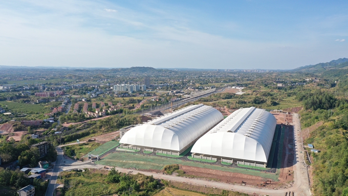 中國(guó)五冶集團(tuán)四川高興煤炭?jī)?chǔ)備基地項(xiàng)目負(fù)責(zé)人文元介紹,目前兩座長(zhǎng)度達(dá)308米、跨度達(dá)106米、高度達(dá)41米的大型鋼結(jié)構(gòu)煤棚已完成前期建設(shè),煤棚PVDF覆膜面積高達(dá)12萬平米,相當(dāng)于16個(gè)標(biāo)準(zhǔn)足球場(chǎng)的大小。在膜結(jié)構(gòu)施工過程中,中國(guó)五冶項(xiàng)目團(tuán)隊(duì)克服了拱形結(jié)構(gòu)跨高比大、張拉精度高、施工難度大等問題,為高興煤炭?jī)?chǔ)備基地穿上“外衣”。