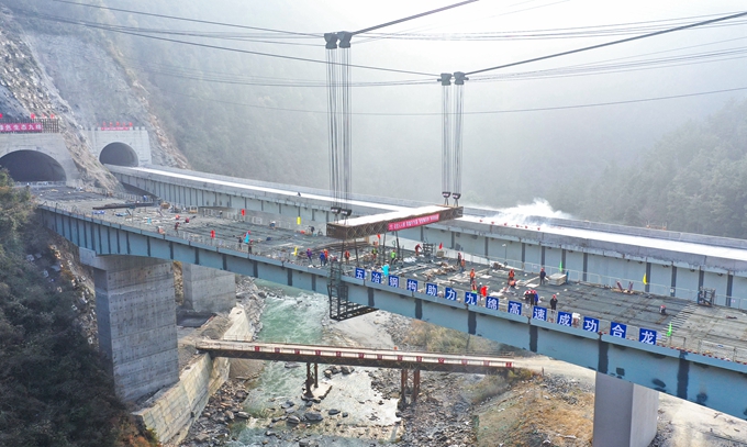 1月10日上午,隨著最后一塊鋼箱梁安裝就位,由五冶鋼構(gòu)實(shí)施的九綿高速桂溪大橋主體鋼箱梁全幅順利合龍,這也是全國(guó)首例應(yīng)用纜索吊裝懸拼安裝工藝的山區(qū)公路鋼箱梁大橋。