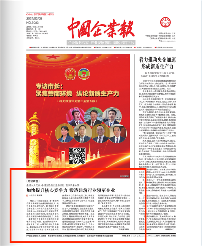 2024年全國(guó)兩會(huì)期間,全國(guó)人大代表,中國(guó)五冶集團(tuán)黨委書(shū)記、董事長(zhǎng)朱永繁接受多家權(quán)威主流媒體專(zhuān)訪(fǎng),積極履職建言獻(xiàn)策,實(shí)事求是講述五冶高質(zhì)量發(fā)展情況。3月8日,《中國(guó)企業(yè)報(bào)》頭版以《加快提升核心競(jìng)爭(zhēng)力 鍛造建筑行業(yè)領(lǐng)軍企業(yè)》為題刊發(fā)對(duì)朱永繁代表的專(zhuān)訪(fǎng)報(bào)道,現(xiàn)對(duì)報(bào)道進(jìn)行全文轉(zhuǎn)發(fā)。