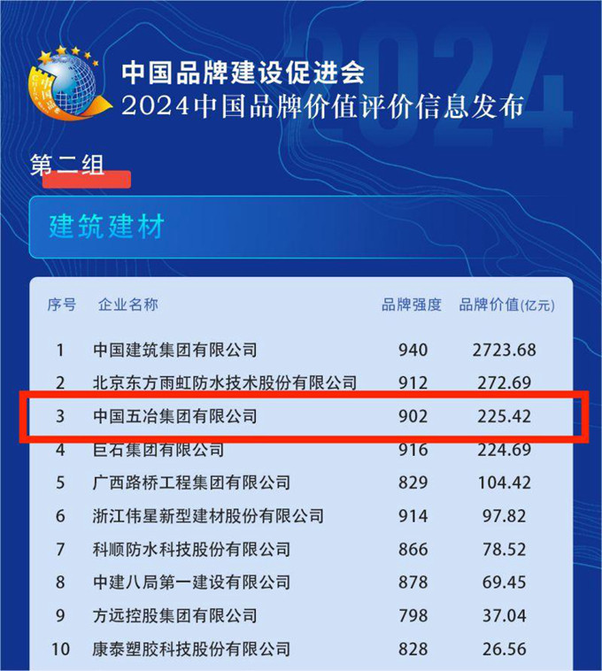5月11日,第八個中國品牌日系列活動期間,中國品牌建設促進會聯(lián)合新華社、中國資產(chǎn)評估協(xié)會等單位聯(lián)合發(fā)布“2024中國品牌價值評價信息”,經(jīng)權威評估,中國五冶集團品牌價值達到225億元,位列全國建筑建材領域參評企業(yè)前三,同類同級企業(yè)第一。