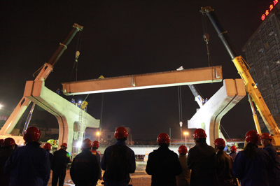 中國五冶集團(tuán)副總經(jīng)理田舜、副總工程師唐世榮和相關(guān)部門負(fù)責(zé)人,中國五冶集團(tuán)路橋工程公司經(jīng)理袁弘毅等班子人員、成都興城投資集團(tuán)董事長助理胥亞斌現(xiàn)場督導(dǎo),經(jīng)過近一個小時的精心施工,圓滿完成本次吊裝。
