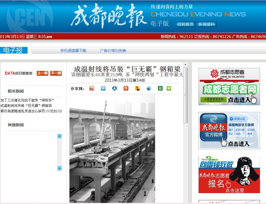 昨日,成都晚報記者獲悉:截至3月11日,成溫射線主體工程已完成大半,現(xiàn)已全面進入底層道路、橋面系及防撞墻施工。在2.5環(huán)(青羊大道)路口,中國五冶集團有限公司首創(chuàng)了“梁體外設鋼桁架、懸掛施工”的特殊支架施工方式,不占用道路資源,空中澆筑蓋梁,還將吊裝“兩快兩射”工程中最大的鋼箱梁。