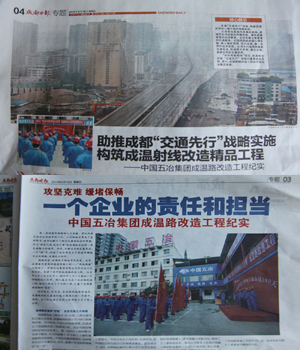 5月5日,由中國五冶集團(tuán)承建的成溫路射線改造工程具備通車條件后,受到多家媒體關(guān)注。5月10日,《成都日?qǐng)?bào)》4版、《成都晚報(bào)》3版分別專題報(bào)道了成溫路改造工程。