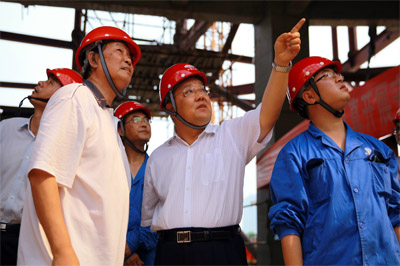 下午三時許,室外溫度超過35°,在成都大魔方項目部,程并強一行和項目部一線員工親切交談,感謝他們冒著高溫不辭辛苦地工作。在觀看大魔方項目動畫演示介紹后,程并強來到演藝中心施工現(xiàn)場,仔細了解工程進度情況和存在的難點問題,他要求項目部嚴格按照公司管理做好工作,相互協(xié)調(diào)溝通,做好總包的經(jīng)驗總結(jié)。