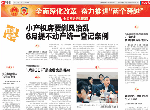 3月11日《四川日?qǐng)?bào)》頭版、04版和12日《四川日?qǐng)?bào)》05版兩會(huì)特刊,刊發(fā)了全國(guó)人大代表、中國(guó)五冶集團(tuán)董事長(zhǎng)、黨委書(shū)記程并強(qiáng)接受采訪的新聞。