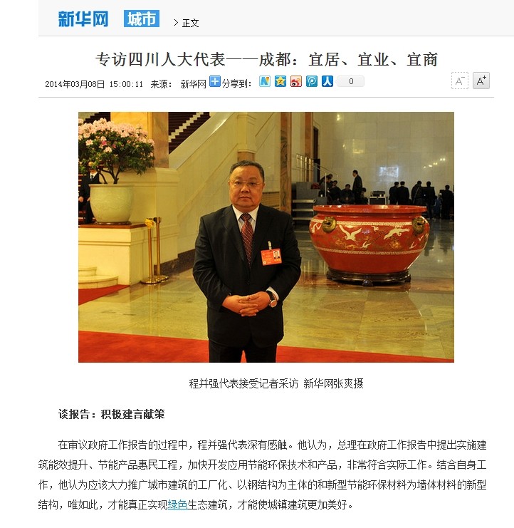 全國兩會(huì)期間,3月8日,新華網(wǎng)刊文播發(fā)了新華網(wǎng)記者采訪四川代表團(tuán)的新聞,圍繞“成都:宜居、宜業(yè)、宜商”主題,對(duì)來自成都的全國人大代表進(jìn)行了專訪。