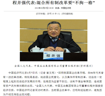 經(jīng)濟(jì)日?qǐng)?bào)、中國經(jīng)濟(jì)網(wǎng)以“混合所有制改革要‘不拘一格’為題,就如何推動(dòng)混合所有制改革等問題對(duì)程并強(qiáng)進(jìn)行了專訪。程并強(qiáng)認(rèn)為,當(dāng)前國企改革中,應(yīng)吸取經(jīng)驗(yàn)教訓(xùn),避免因?yàn)椴灰?guī)范導(dǎo)致出現(xiàn)問題。應(yīng)該從以下幾個(gè)方面努力。一是需要多種形式,不能狹隘的理解混合所有制,就是“拿出”國有資產(chǎn),讓民營企業(yè)參與進(jìn)來。二是需要防止國有資產(chǎn)流失。三是人才選用與薪酬體系,應(yīng)與市場接軌。
