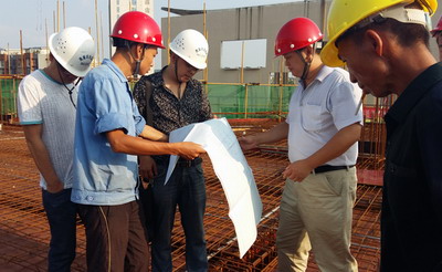 南充場館項(xiàng)目陪同監(jiān)理單位對工程鋼筋綁扎情況進(jìn)行檢查