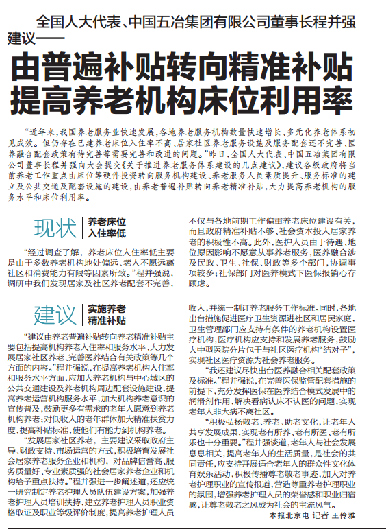 3月8日,《成都日報》和《香港商報網(wǎng)》分別刊文就全國人大代表,中國五冶集團(tuán)董事長、黨委書記程并強(qiáng)向大會提交的《關(guān)于推進(jìn)養(yǎng)老服務(wù)體系建設(shè)的幾點建議》進(jìn)行了詳細(xì)的采訪報道。