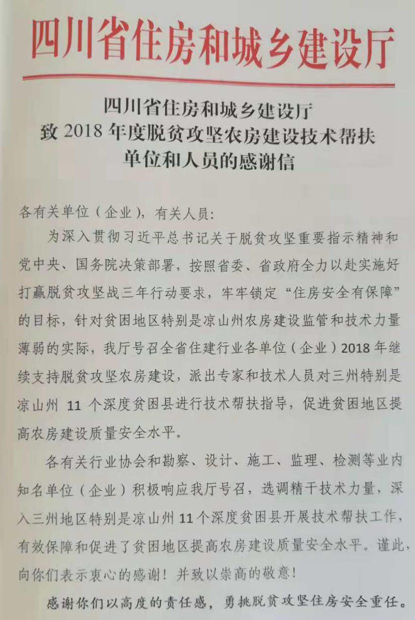 《感謝信》表示,感謝你們以高度的責(zé)任感,勇挑脫貧攻堅(jiān)住房安全重任。在2016年、2017年對涼山州脫貧攻堅(jiān)農(nóng)房建設(shè)技術(shù)幫扶支持的基礎(chǔ)上,再次組織和選調(diào)技術(shù)骨干,組成技術(shù)幫扶組駐守深度貧困縣,展現(xiàn)了住建行業(yè)模范企業(yè)的擔(dān)當(dāng)和風(fēng)采,發(fā)揮了行業(yè)榜樣的作用。感謝你們竭盡全力攻堅(jiān)克難,與廣大貧困群眾同心同行確保安全。你們派駐的專家和專業(yè)技術(shù)人員走村寨、訪農(nóng)戶,深入脫貧攻堅(jiān)農(nóng)房建設(shè)現(xiàn)場,吃苦耐勞、盡職盡責(zé),有效幫助地方完善農(nóng)房質(zhì)量安全監(jiān)管體系,培訓(xùn)指導(dǎo)建房工匠,及時(shí)發(fā)現(xiàn)質(zhì)量安全問題并指導(dǎo)各方責(zé)任主體落實(shí)整改,為保障三州脫貧攻堅(jiān)農(nóng)房建設(shè)質(zhì)量安全做出了貢獻(xiàn)。